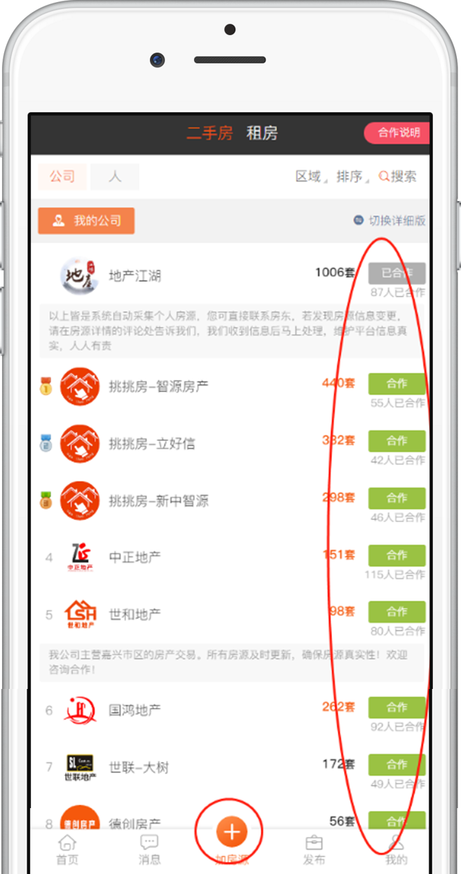 地产江湖独创合作模式,点击APP底部“+房源”按钮则可以合作每家公司的房源