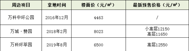 地价方面,中环北附近区域,近来年先后出让过多宗住宅用地。在信远朗庭之后,该区域先后开发了万科中环公园、万城赞园、万科环萃园等项目。其中开发较早的中环公园,当时拿地的楼面价为4463元/㎡;万城赞园的拿地楼面价为8023元/㎡,为中环北楼面价之最;而时间最近的万科环萃园,拿地的楼面价为6500元/㎡。