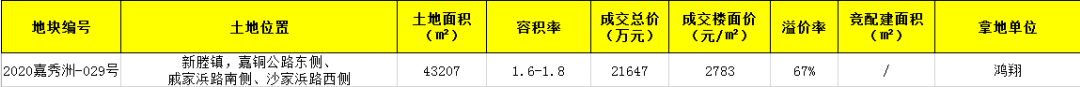 今日新塍镇出让一宗住宅用地,地块编号为2020嘉秀洲-029号,经历204轮报价,最终以21647万元,溢价率67%,楼面价2783元/㎡成交,被鸿翔摘得。