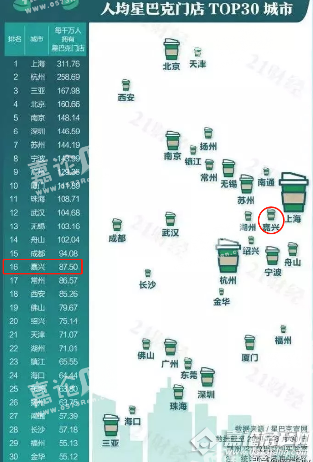 嘉兴在人均星巴克门店拥有量上排名16,名次还高于西安、佛山、天津、东莞等城市。截止目前,门店数量有42家,在省内与温州持平,在杭州和宁波之后。