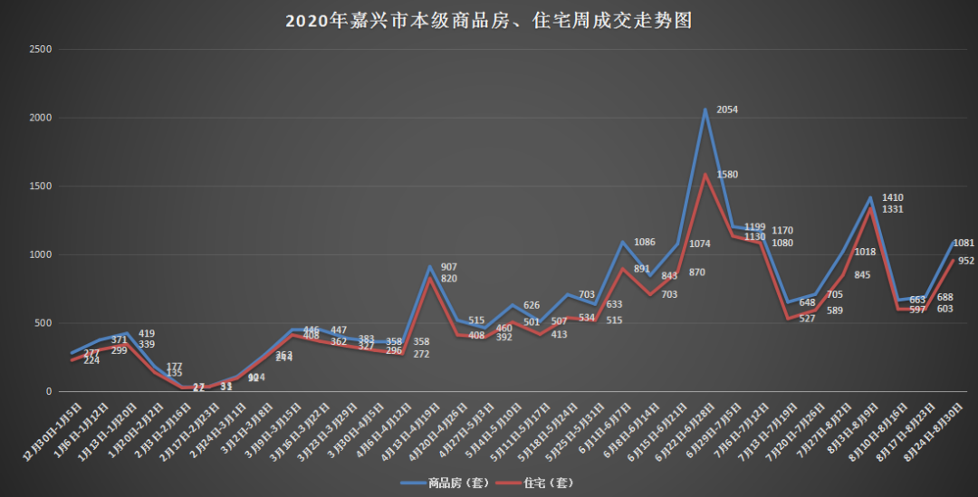 据嘉兴市房地产公众服务平台数据显示,2020年8月第4周(8.24-8.30),嘉兴市本级商品房共成交1081套,面积11.44万方;