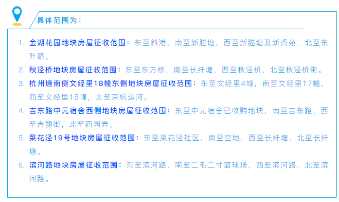 分别是金湖花园地块、秋泾桥地块、杭州塘南侧文经里18幢东侧地块、吉东路中元宿舍西侧地块、菜花泾19号地块、滨河路地块。