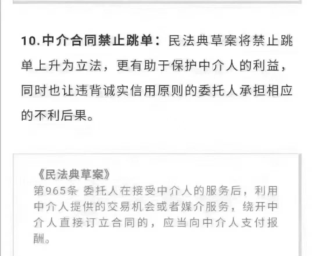 10:中介合同禁止跳单:民法草案将禁止跳单上升为立法,更有助于保护中介的利益,同时也让违背诚实信用原则的委托人承担相应的不利后果。