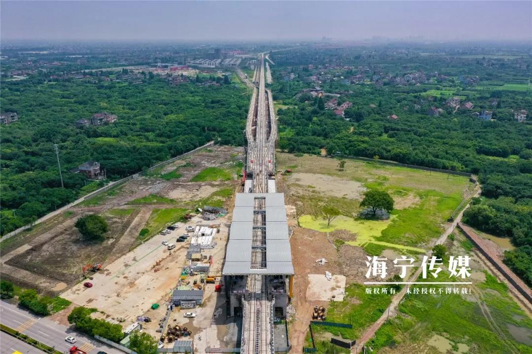 高架区间累计完成100%,地下区间完成100%,高架车站完成100%,地下车站完成98.5%,车辆基地(含控制中心)完成100%,铺轨完成97%,机电工程60.28%,6辆列车已抵达盐官车辆基地。