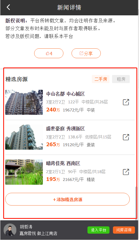 您只要点击添加房源,就可以去每天安排一些优质的房源,进行插播,与文章浑然天成